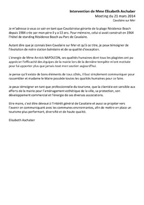 L’énergie de Mme Annick NAPOLEON, ses qualités humaines dont tous les plagistes ont pu apprécier l’efficacité des équipes de la mairie lors de la dernière tempête m’ont motivée pour lui apporter plus que jamais tout mon soutien aujourd’hui.