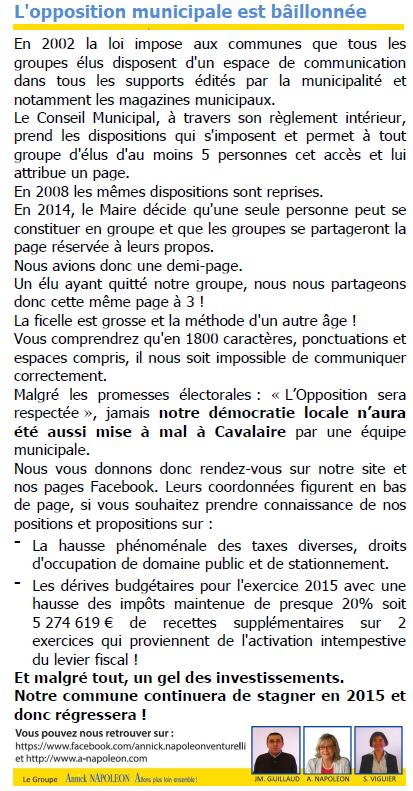 NOTRE COMMUNICATION POUR LE MAGAZINE MUNICIPAL D’AVRIL 2015