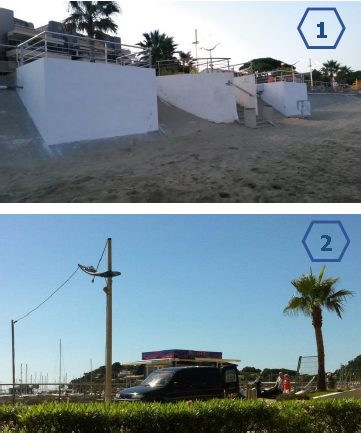 Des casiers-consignes eux sont bien prévus dans ce projet. Monsieur CORNA nous le confirmait en réponse à une question de notre groupe lors du conseil municipal du 21 mai 2015. Or, nous pouvons constater (photo 1) qu’aucune cavité n’est réservée dans ces avancées. Il faudra donc reprendre ces travaux pour les créer ce qui génèrera des dépenses supplémentaires, tout comme le raccordement définitif de ces kiosques au réseau électrique afin de supprimer ces poteaux disgracieux fixés aux rambardes (voir photo 2).