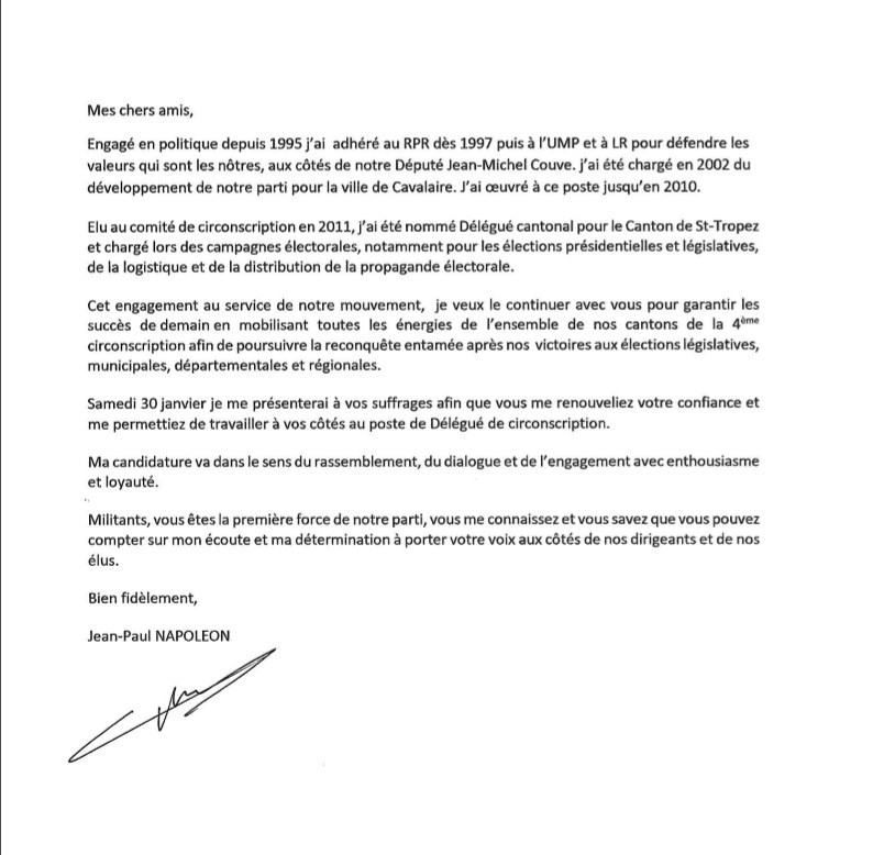 Je suis donc candidat au poste de Délégué de la 4ème circonscription pour les élections internes de mon parti Les Républicains - 4ème VAR.