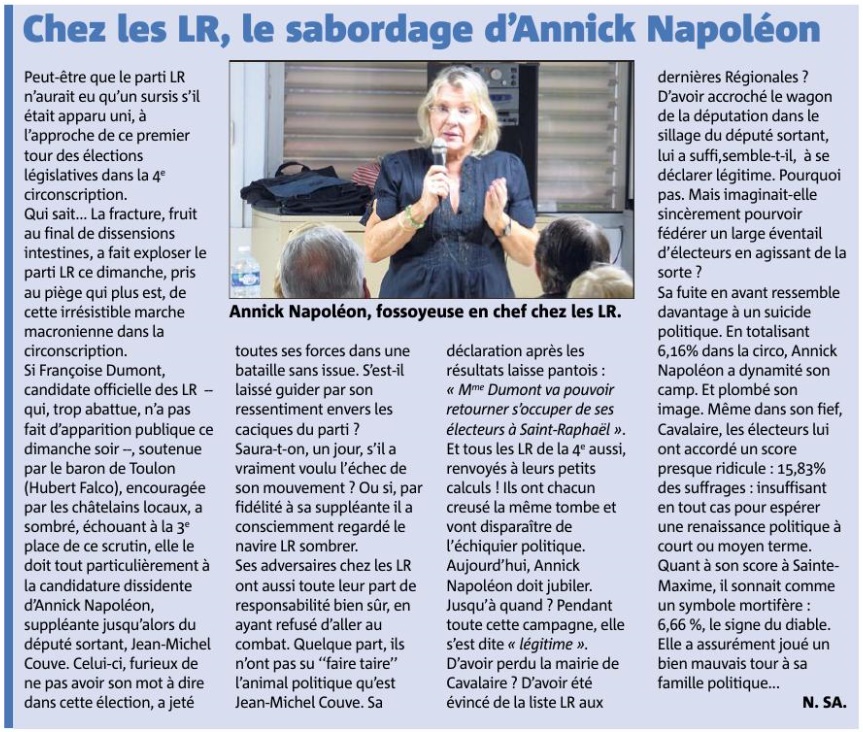 Je souhaite revenir sur les articles parus dans Var matin, édition du 13 juin et apporter quelques précisions chiffrées afin de récuser la soi-disant responsabilité que j’aurai dans l’échec de F. Dumont et du parti LR auquel je n’adhère plus depuis janvier 2017.