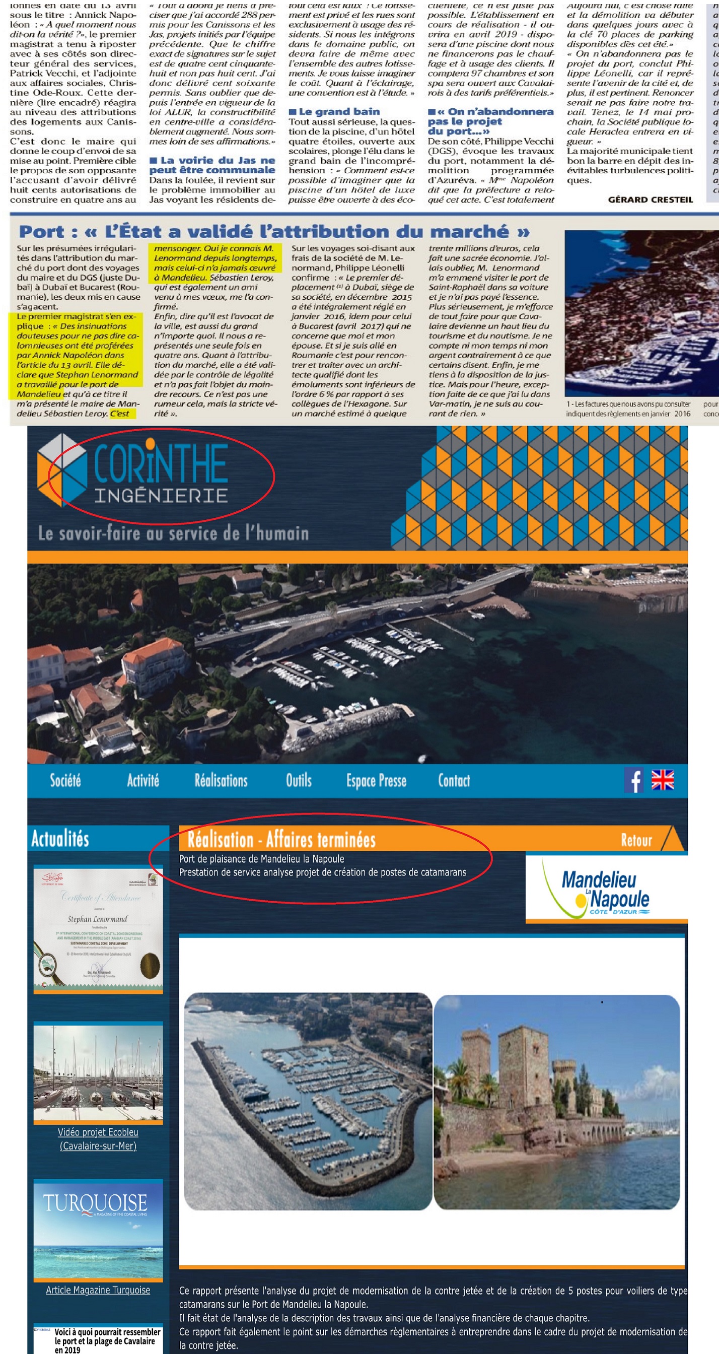 Or, il suffit d’aller consulter le site de la société CORINTHE, dont M. LENORMAND est le président, sur lequel sont listées les réalisations et affaires terminées par sa société. Et parmi celles-ci, que trouvons-nous : le projet de modernisation du port de Mandelieu La Napoule réalisé par la société CORINTHE !!!!!