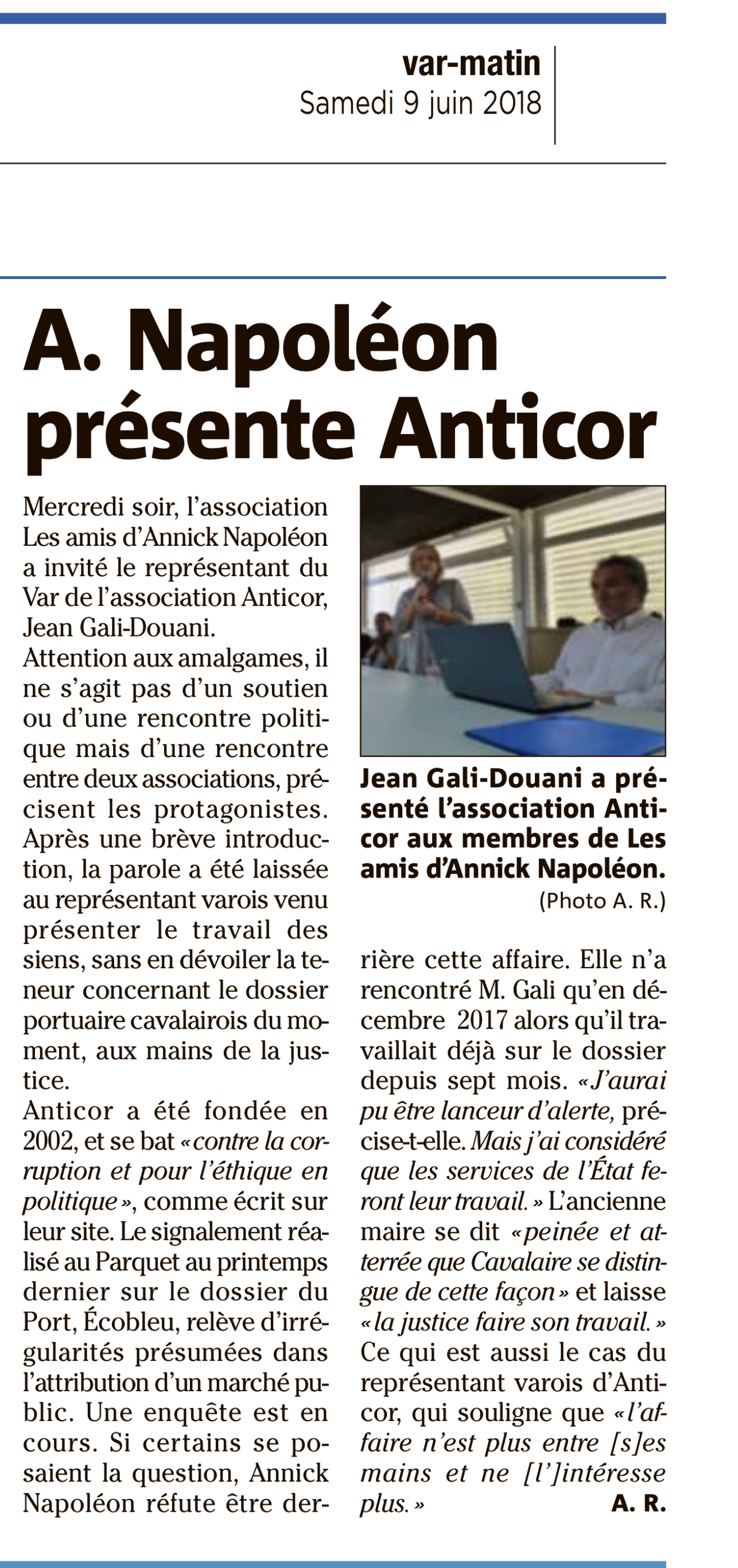 Ci-dessous le compte-rendu de Var-Matin de la réunion de notre association, qui s'est tenue le 6 juin 2018, dont l'objet était la présentation d’ANTICOR par Jean GALLI le référent de l’Association ANTICOR pour le Var.